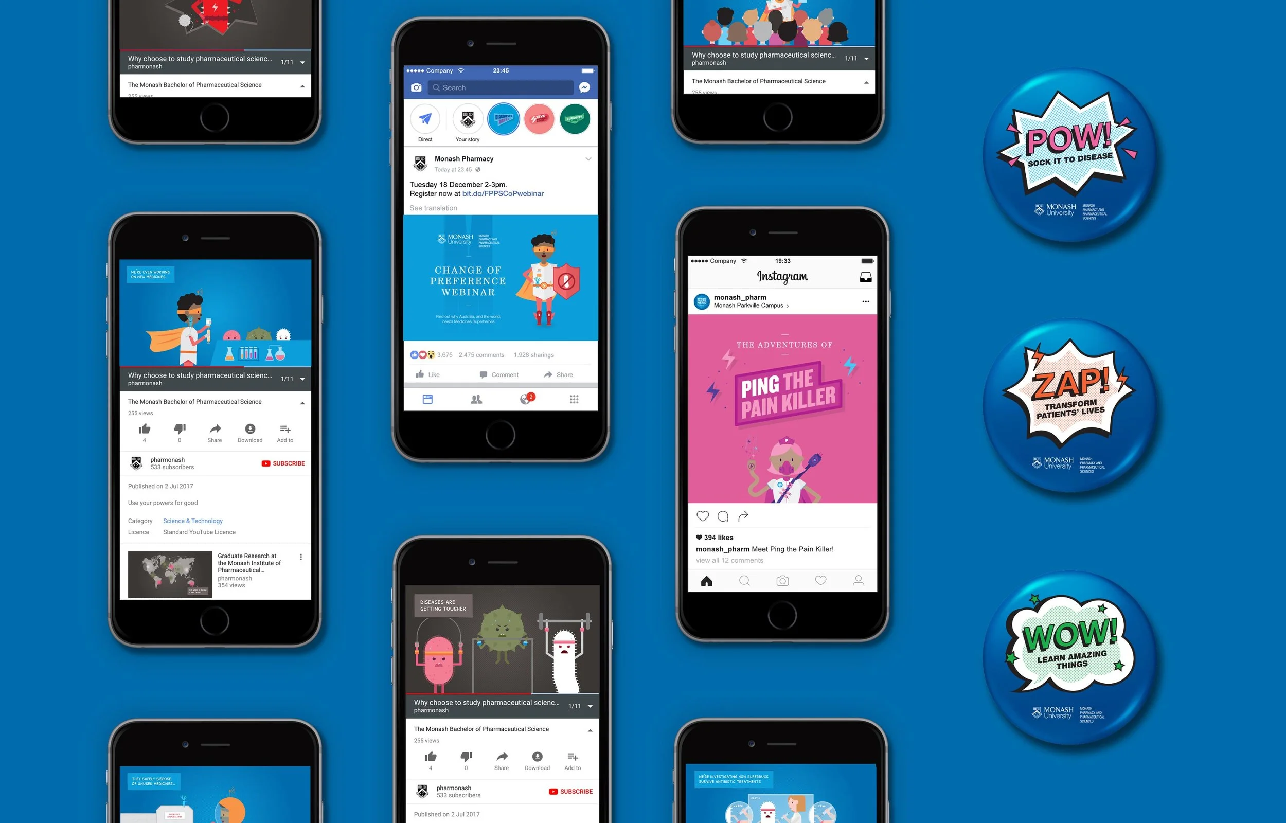 The concept drew parallels between superheroes—extraordinary individuals who save lives and excel at what they do—and the impact of graduates and researchers in advancing healthcare. Each illustration captures the skills and knowledge students gain at Monash University, showcasing their preparation to tackle global health challenges and improve communities worldwide.