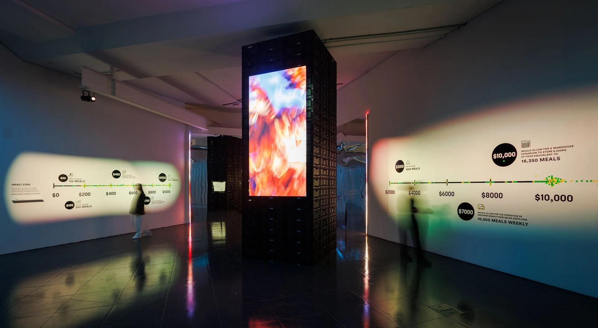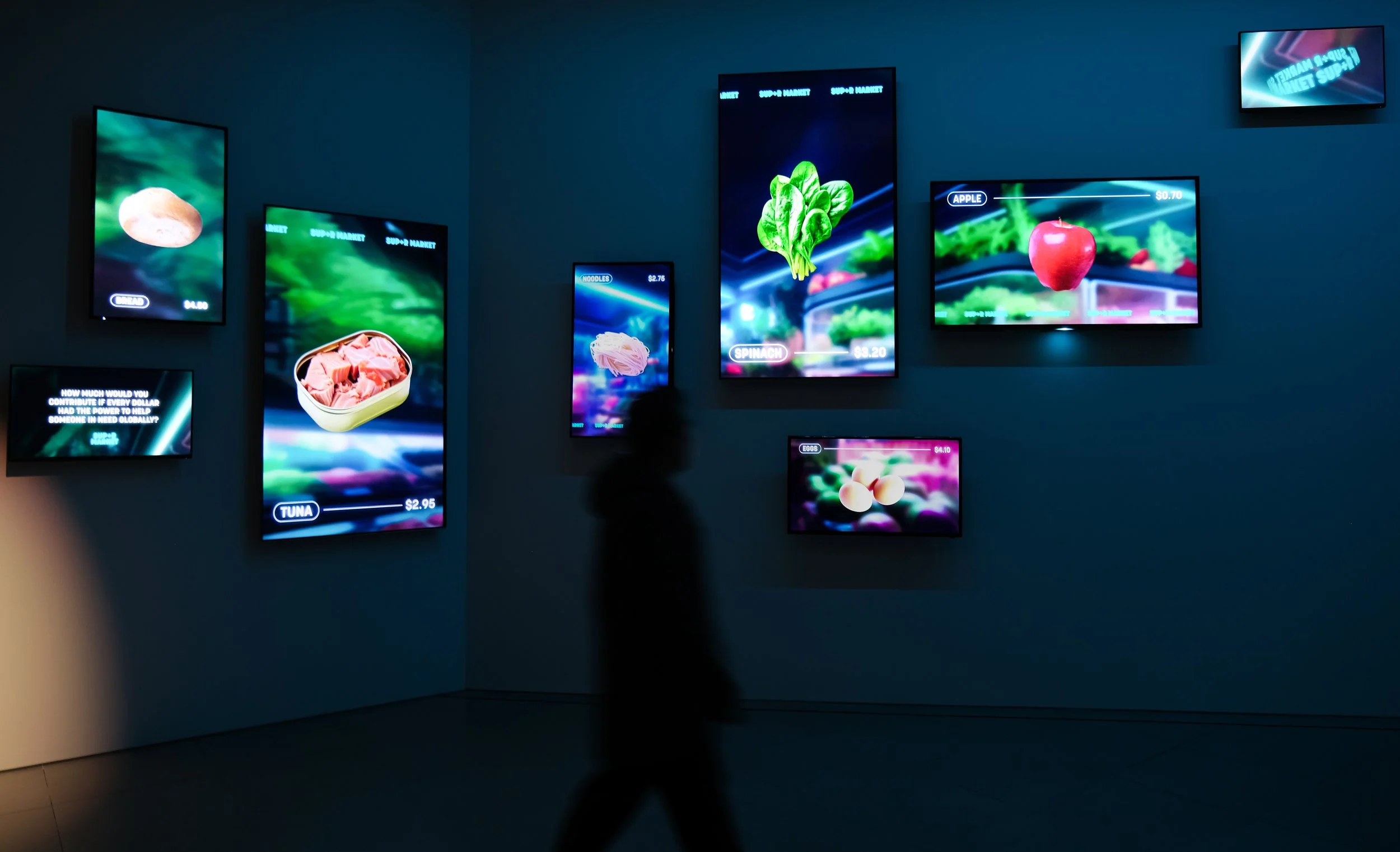 One interactive section invited visitors to select an amount they would contribute, revealing how that sum translated to global assistance through everyday grocery items. The experience asked the poignant question: “How much would you contribute if every dollar had the power to help someone in need globally?” Visual concepts for this section were inspired by the aesthetic of a futuristic AI-designed supermarket, creating a sleek, lab-like atmosphere to emphasize innovation and possibility.